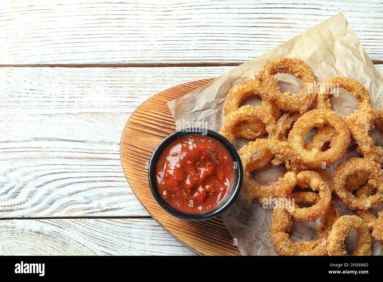 Homemade Crunchy Fried Onion Rings With Tomato Sauce On Wooden Table Top View Stock Photo Alamy
